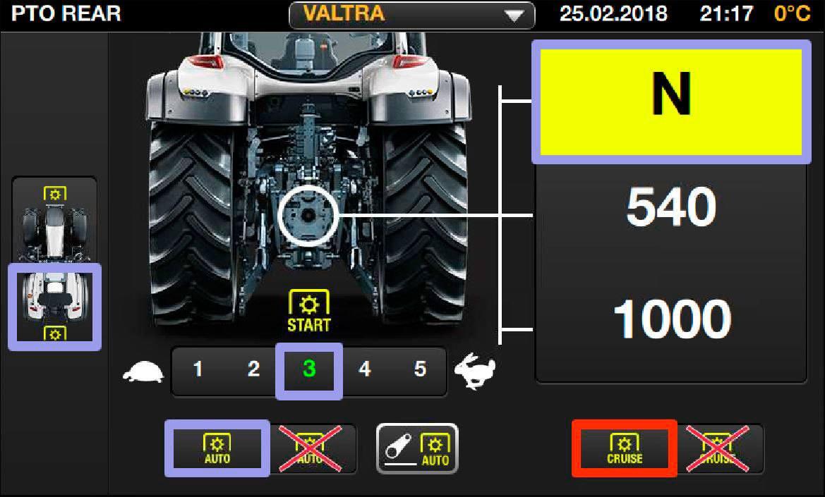 - Selecteer of u instellingen wilt maken voor de aftakas aan de voor- of achterzijde. Begin bijvoorbeeld met het instellen van het aftakastoerental. PTO-cruise is een handige functie die automatisch het ideale motortoerental selecteert wanneer u de aftakas activeert, zodat u het handgas of voetpedaal niet hoeft te gebruiken om het toerental aan te passen. Een andere handige functie is Auto-PTO, waarmee u kunt instellen of de aftakas in- of uitgeschakeld moet worden wanneer de hefinrichting achter in een bepaalde positie staat. Als u bijvoorbeeld een rotorkopeg gebruikt, kunt u de aftakas zo instellen dat hij uitschakelt wanneer de hefarmen boven een bepaalde hoogte worden opgeheven en opnieuw wordt ingeschakeld wanneer de armen onder dezelfde of een andere hoogte zakken.