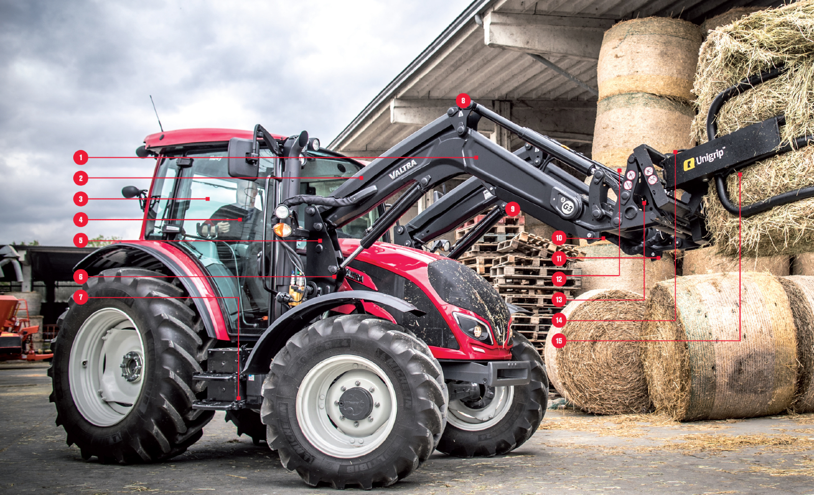 Alle hydraulische bronnen bevinden zich in het midden van de dwarsbalk van de lader. Dit geeft directe, nauwkeurige controle en verdeelt de olie gelijkmatig over beide kanten. Alle componenten worden beschermd door een duurzame beschermhoes.